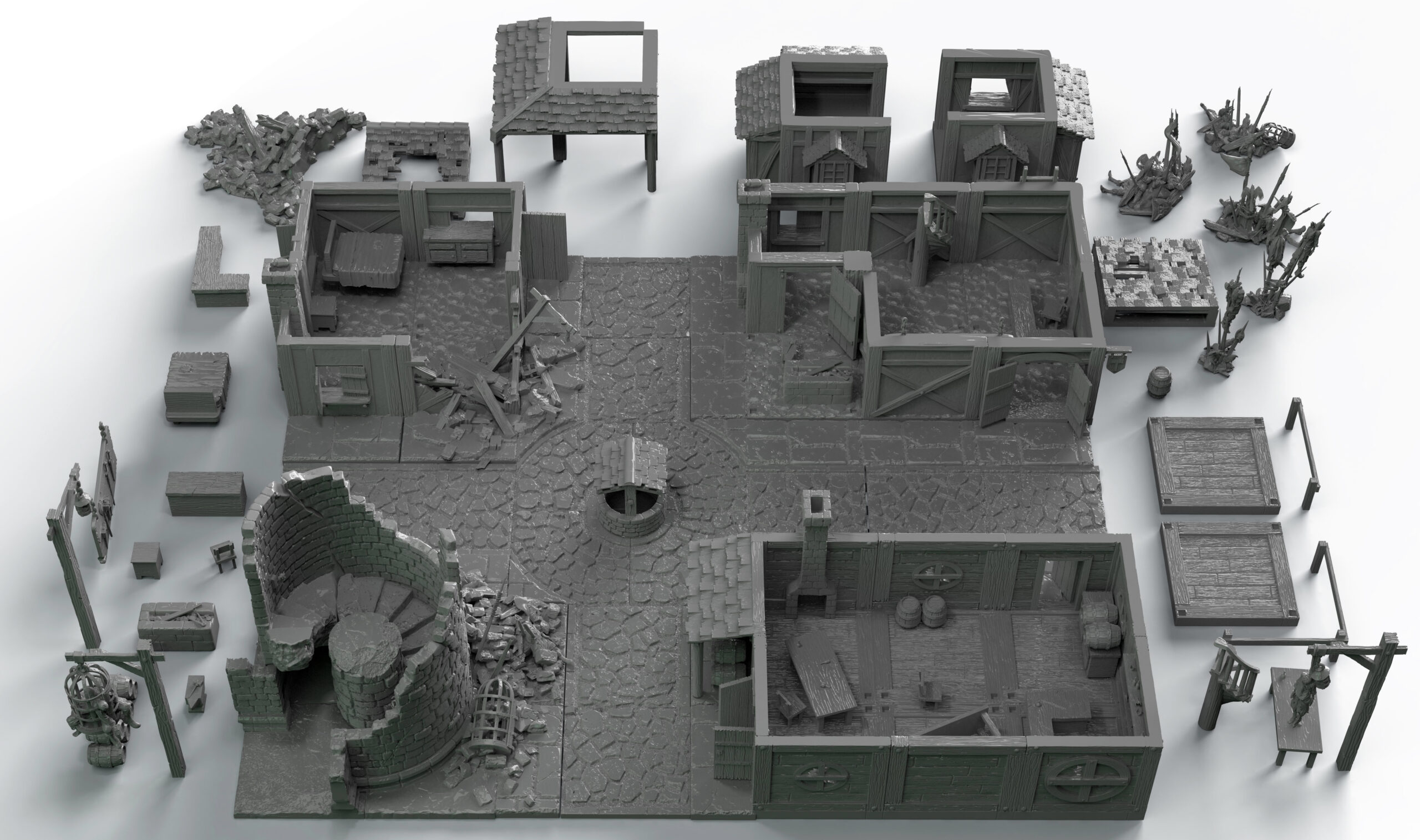 Groupe décors ville médiévale route pavée – puit – maisons – tour en ruine – charnier – cage – pendu
