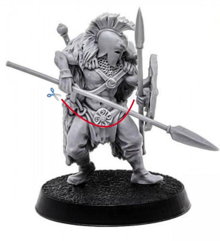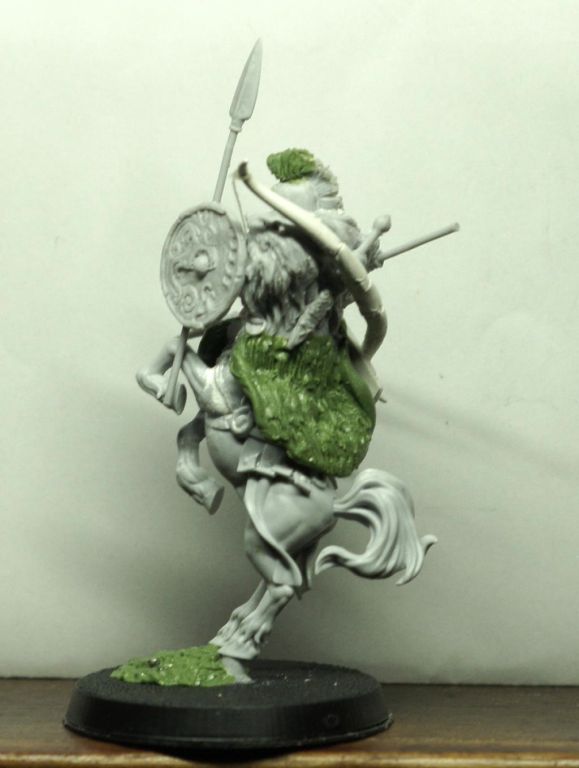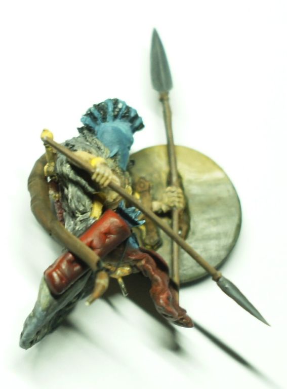 A la finition, au moment de rajouter la corde car elle me gênait pour la peinture, un des bouts de l'arc a cassé. Je prévois donc de le refaire en utilisant à la place de la greenstuff, et de le faire plus fin car il est un peu gros par rapport aux mains du spartiate. Celui-ci est tigé dans le dos de la figurine pour qu'il tienne correctement et ne se décroche pas lors des transports ou des manipulation en jeu.