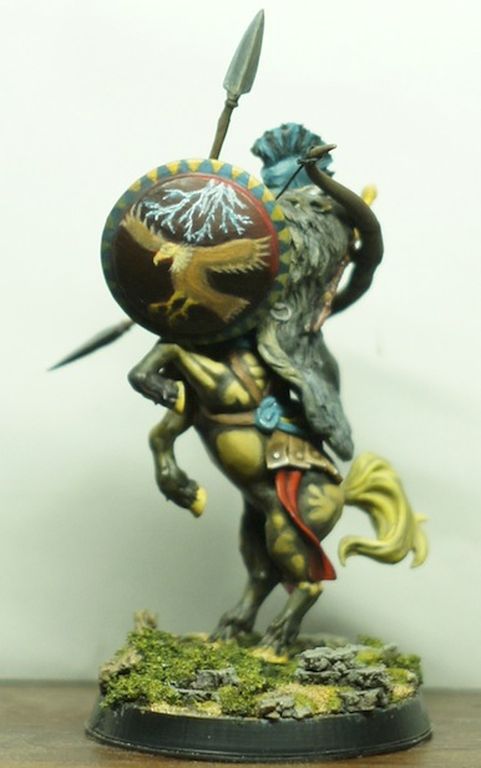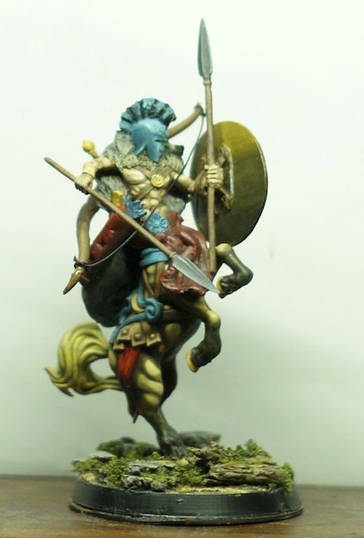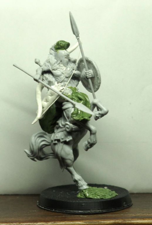 3ème étape : rajouter une jupe pour marquer le mouvement, augmenter l’impression d'avoir une pièce d'un bloc sans séparation, voir camoufler les imperfections au niveau de la jointure entre le buste du spartiate et le corps du centaure.