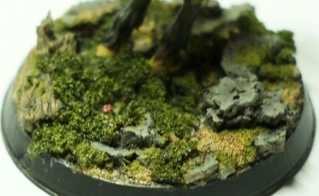 Pour le socle, quelques morceaux d'une feuille de liège d'1mm découpés à la main et empilés les uns sur les autres, un tronc d'arbre sculpté à la main en greenstuff, de la mousse synthétique de 2 tailles différentes parsemée sur de la colle, et pour boucher les trous un peu de sable fin et le tour est joué.