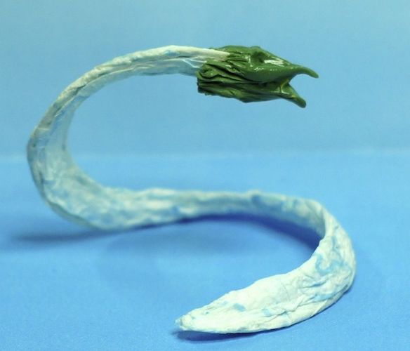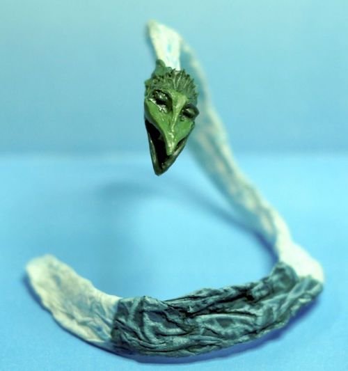 Je me suis attaqué pour finir au visage de la forme. Au départ j'avais pensé à une tête de dragon, mais ce type de tête étant assez similaire à la tête d'un Wolfen, j'ai choisi de partir sur une inspiration de tête d'oiseau comme pour un Phoenix. Au final, le rendu est très intéressant car une fois sec cela est plutôt rigide. Maintenant il faut voir le rendu une fois peint.